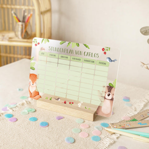 Der Stundenplan im verspielten Tiergruppen-Design wird mit dem Namen des Kindes bedruckt und begleitet es liebevoll durch die Woche. Dank der bunten Illustrationen, der klaren Einteilung und der hochwertigen Verarbeitung wird das Planen der Schultage zum Kinderspiel – und zum echten Hingucker am Schreibtisch oder Kühlschrank.