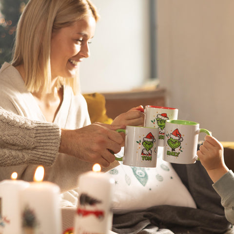 • Wunderschöne Kaffeetasse, mit einem Motiv vom Grinch, personalisiert mit Namen.