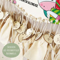 Bei den Produktbildern handelt es sich um Anwendungsbeispiele. Der Kalender wird standardmäßig als Holzplatte mit personalisiertem Druck und Bohrungen geliefert und bietet die ideale Grundlage zum kreativen Basteln. Ergänzend sind passende Holzplättchen mit den Zahlen 1–24 sowie farbige Baumwollbeutel erhältlich.
