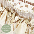 Bei den Produktbildern handelt es sich um Anwendungsbeispiele. Der Kalender wird standardmäßig als Holzplatte mit personalisiertem Druck und Bohrungen geliefert und bietet die ideale Grundlage zum kreativen Basteln. Ergänzend sind passende Holzplättchen mit den Zahlen 1–24 sowie farbige Baumwollbeutel erhältlich.