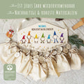 Bei den Produktbildern handelt es sich um Anwendungsbeispiele. Der Kalender wird standardmäßig als Holzplatte mit personalisiertem Druck und Bohrungen geliefert und bietet die ideale Grundlage zum kreativen Basteln. Ergänzend sind passende Holzplättchen mit den Zahlen 1–24 sowie farbige Baumwollbeutel erhältlich.