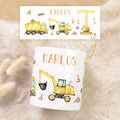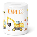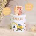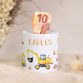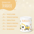 Eigenschaften Bedruckte Spardose für Kinder - im Baustelle Design - mit Namen personalisiert