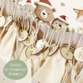 Bei den Produktbildern handelt es sich um Anwendungsbeispiele. Der Kalender wird standardmäßig als Holzplatte mit personalisiertem Druck und Bohrungen geliefert und bietet die ideale Grundlage zum kreativen Basteln. Ergänzend sind passende Holzplättchen mit den Zahlen 1–24 sowie farbige Baumwollbeutel erhältlich.